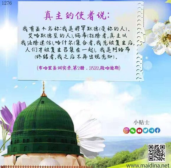真主的使者说:我有五个名称:我是穆罕默德(受称的人)、艾哈默德至的人),玛希(社除者,真主以我法除迷信),哈什尔(集合者,我先被复生后,人们才被复生召集在一起), 我是阿给布(终结者,我之后不再出现先知)。(布哈里圣训实录,第2册,3532,段哈迪斯) “Contact Links” YouTube https://youtube.com/channel/UCYz3e0kw4KUZLKJk0SRyMTw Twitter link https://twitter.com/xiaotieshishi 脸书的链接 https://www.facebook.com/xiaotieshi/ 加入WhatsApp群4 https://chat.whatsapp.com/IJNu5omeMdgHhJlEZKYx7k 继续阅读