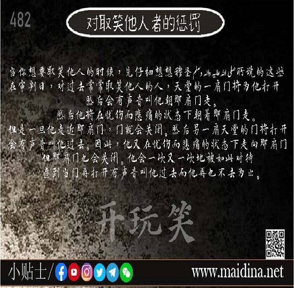 当你想要取笑他人的时候,先仔细想想穆圣صَلَّى الم所说的这些:在审判日,对过去常常取笑他人的人,天堂的一扇门将为他打开,然后会有声音叫他朝那扇门走。然后他将在忧伤而悲痛的状态下朝着那扇门走。但是一旦他走近那扇门,门就会关闭。然后另一扇天堂的门将打开,会有声音叫他过去。因此,他又在忧伤而悲痛的状态下走向那扇门,但那扇门也会关闭。他会一次又一次地被如此对待,直到当门再打开有声音叫他过去而他再也不去为止。 Dāng nǐ xiǎng yào qǔxiào tārén de shíhòu, xiān zǐxì xiǎng xiǎng mù shèngṣalãy̱ ạlm suǒ shuō de zhèxiē: Zài shěnpàn rì, duì guòqù chángcháng qǔxiào tārén de rén, tiāntáng 继续阅读