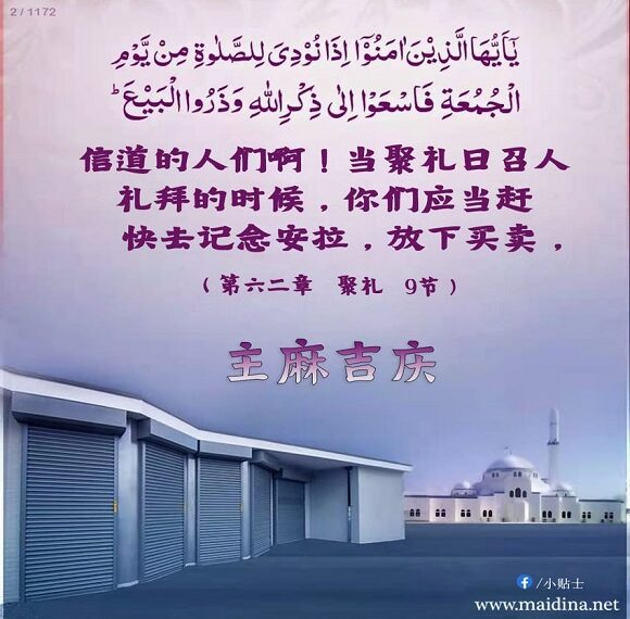 يَا أَيُّهَا الَّذِينَ آمَنُوا إِذَا نُودِيَ لِلصَّلَاةِ مِن يَوْمِ الْجُمُعَةِ فَاسْعَوْا إِلَىٰ ذِكْرِ اللَّهِ وَذَرُوا الْبَيْعَ ۚ (9) 信道的人们啊!当聚礼日召人礼拜的时候,你们应当赶快去记念安拉,放下买卖,(第六二章 聚礼 9节) Xìndào de rénmen a! Dāng jù lǐ rì zhào rén lǐbài de shíhòu, nǐmen yīngdāng gǎn kuài qù jìniàn ān lā, fàngxià mǎimài,(dì liù’èr zhāng jù lǐ 9 jié) 继续阅读
