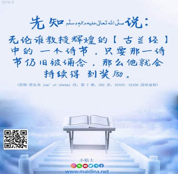 无论谁教授辉煌的【古兰经】中的 一个诗节,只要那一诗节仍旧被诵念,那么他就会持续得 到奖励。(贾穆-贾瓦米 Jam’ul-Jāwāmi 经,第 7 册,282 页,22455- 22456 段哈迪斯) “Contact Links” YouTube https://youtube.com/channel/UCYz3e0kw4KUZLKJk0SRyMTw Twitter link https://twitter.com/xiaotieshishi 脸书的链接 https://www.facebook.com/xiaotieshi/ 加入WhatsApp群4 https://chat.whatsapp.com/IJNu5omeMdgHhJlEZKYx7k Telegram link 继续阅读